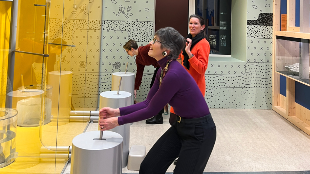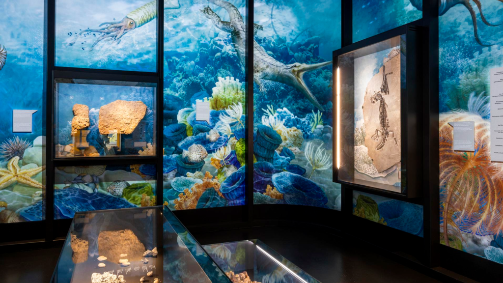 Anschliessend gingen wir auf Zeitreise in die neue Dauerausstellung: In bildstarken Inszenierungen macht die Ausstellung ungewohnte Zusammenhänge sichtbar und schärft den Blick auf das einzigartige Raumschiff Erde, mit dem wir seit Jahrmillionen unterwegs sind. Dabei wird deutlich, welcher Wert Fossilien als Spuren und Zeugen des Lebens zukommt. Denn dank ihrer Erforschung wissen wir, was wir heute wissen. Die Erforschung ihrer Überreste kann heute mithelfen, Lehren für den aktuellen Klimawandel zu ziehen.